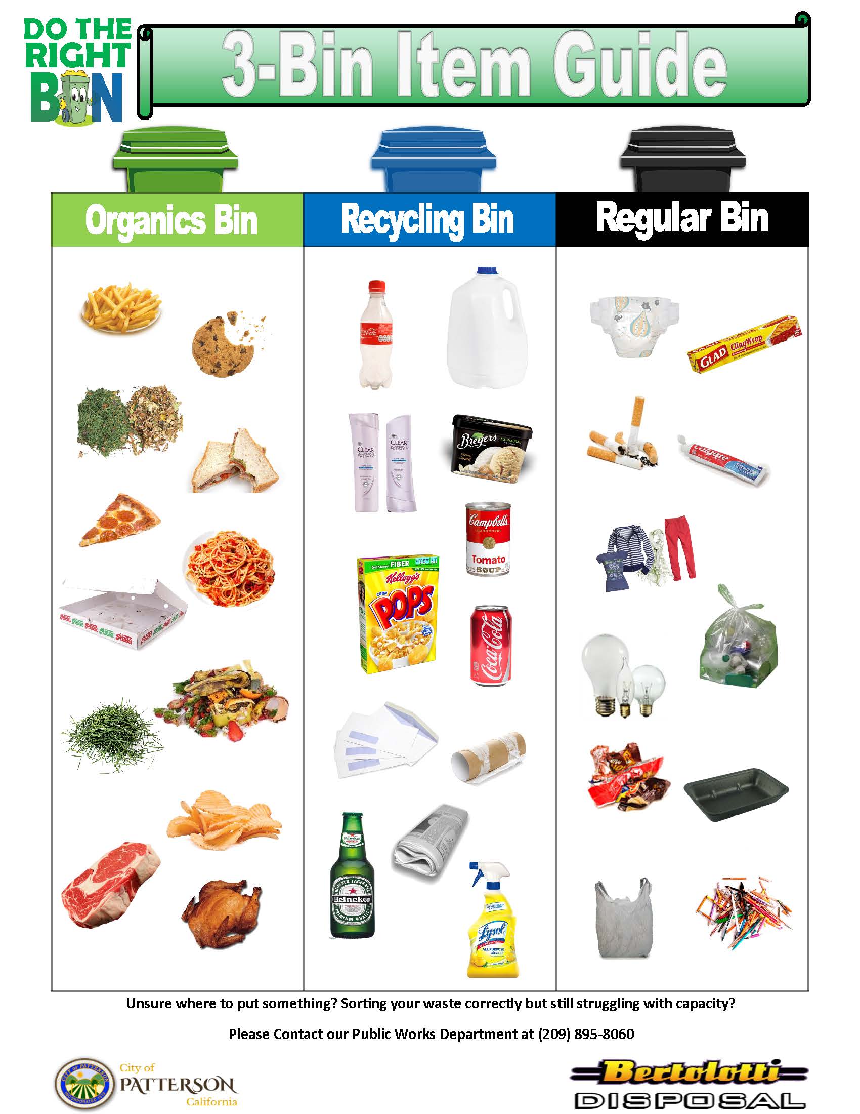 No need to do anything different when it comes to garbage, recycling and yard trimmings. The City of Patterson's Residential Garbage & Recycling Program is compliant with SB 1383 because organics are already composted. Just remember that food and food-soiled items belong in the garbage and not in Green Organics Bin. Keep organic material out of your Blue Recycling Bin. Remember that is placed in the Regular Black Trash Bin that does not belong in the green or blue bins ends up in the County landfill plant located on Fink Road. Click here for 3-Bin Recycling Guide.