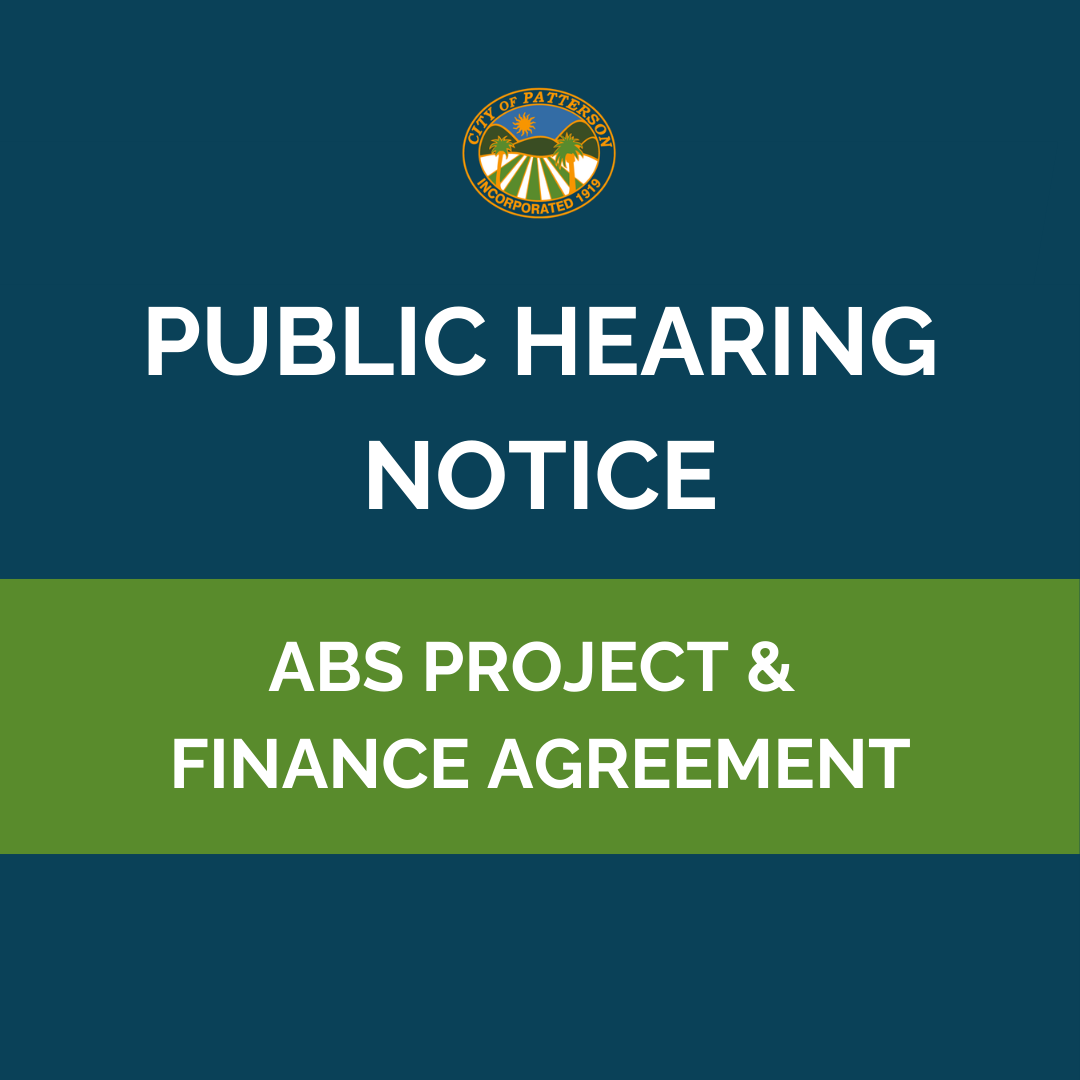 City Council of the City of Patterson will hold a public hearing on Tuesday, March 17, 2026, at 7:00 p.m., or as soon thereafter, in the City Council Chambers, 1 Plaza, Patterson, CA to consider the following: